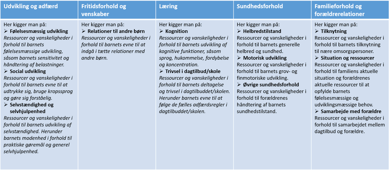 Ressourcevurderingen består af en række udsagn/spørgsmål, som barnets udvikling og trivsel vurderes i forhold til. Vurderingen er bygget op omkring nedenstående temaer: