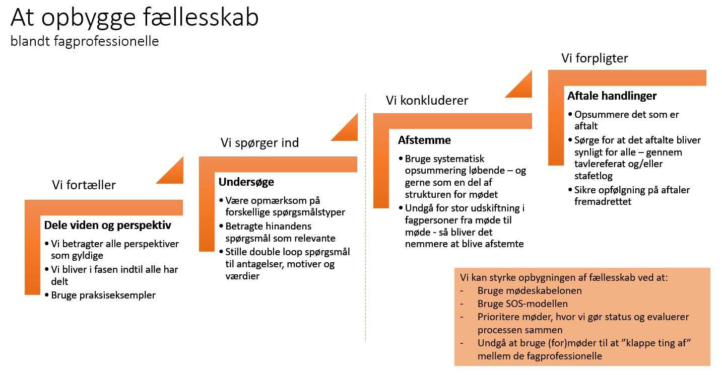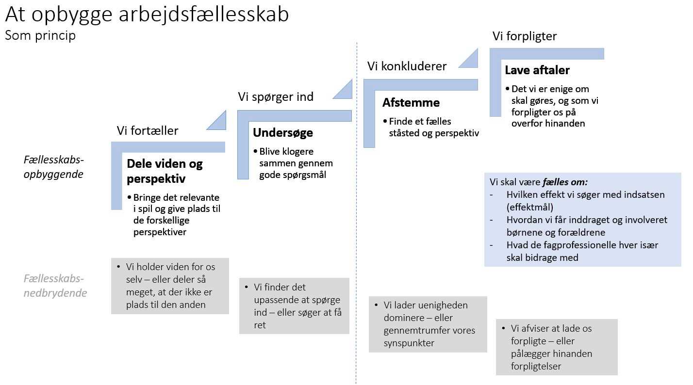 - Et andet væsentligt element i tilgangen er samarbejde mellem fagpersoner, forældre og barn. Har man dette samarbejde for øje, sikrer man det bedste fundament for at udvikle løsninger, der skaber trivsel for barnet.