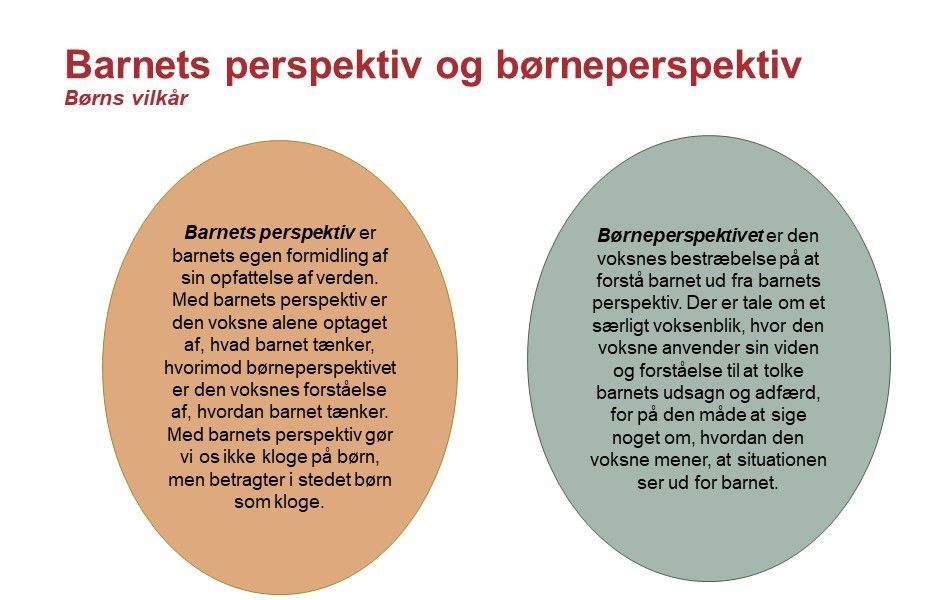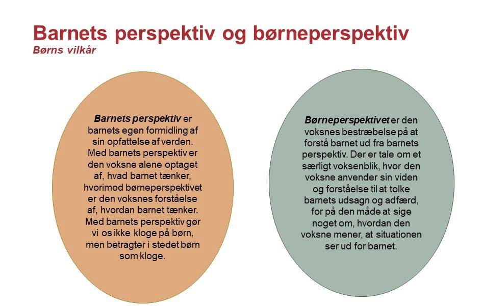 - Det centrale i tilgangen er barnet: barnets perspektiv, inddragelse af barnet samt barnets trivsel og tryghed.
