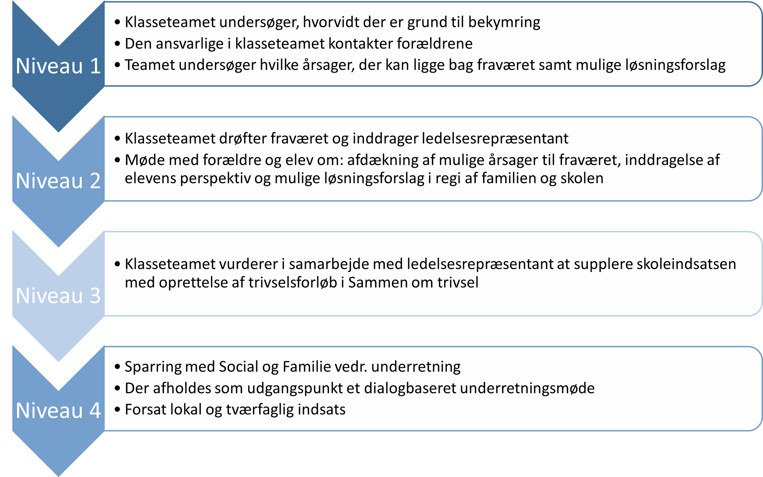 Har en elev bekymrende fravær, sættes følgende faser og aktiviteter i værk. Det er altid den enkelte elevs behov, der afgør, hvilket niveau der skal sættes i værk. Det vil sige, at man bevæger sig op og ned i modellen afhængigt af, hvilke fagligheder der er behov for at konsultere og afhængigt af om de indsatser, der iværksættes, fungerer. Ved behov springes niveauer over, så man kan sætte ind med de rigtige indsatser og rigtig styrke fra begyndelsen.